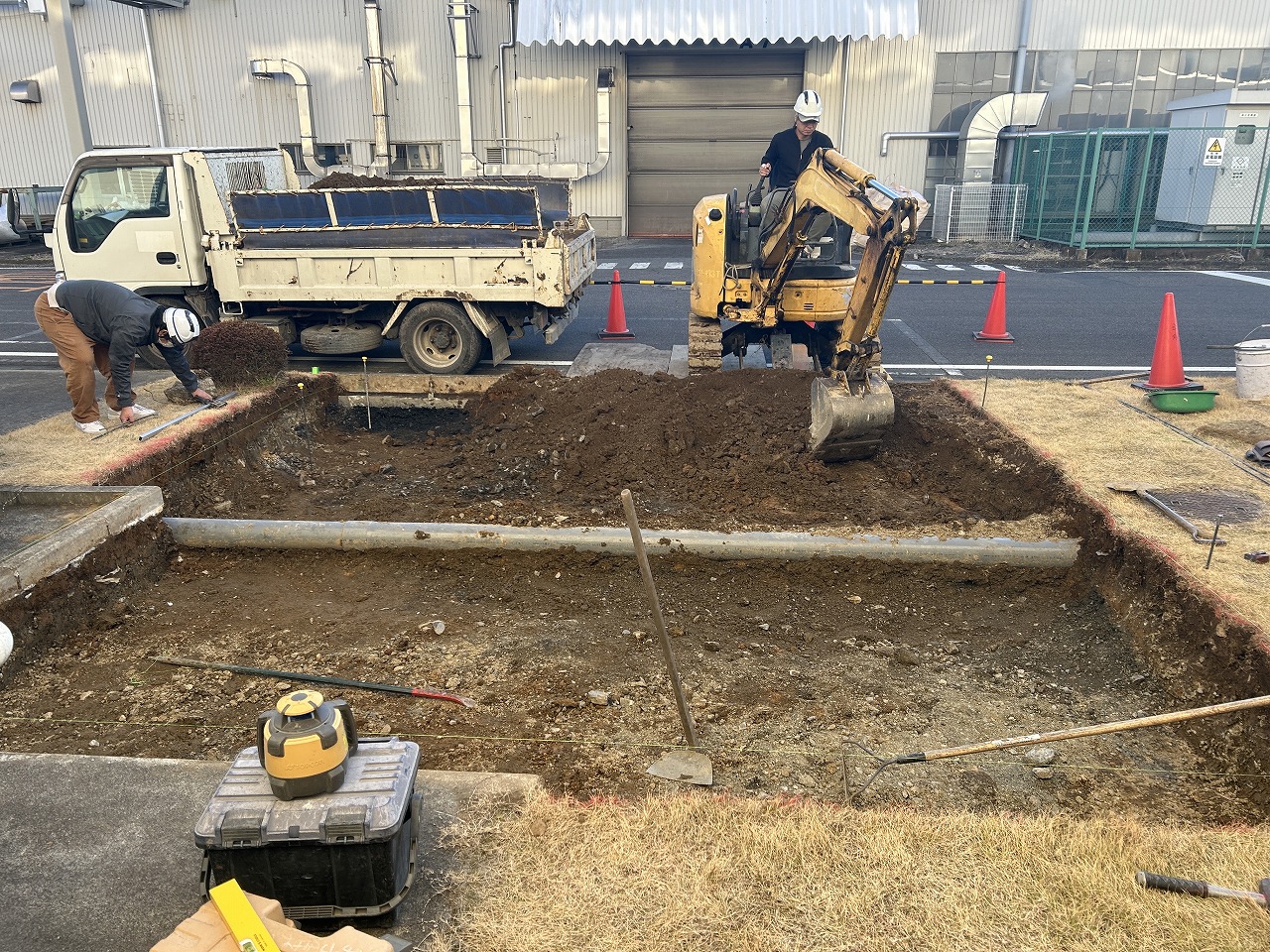 まずはコンクリート土間用に掘削をしていきます。重量物を考慮し300mmほど掘削しました。面積は24㎡です。