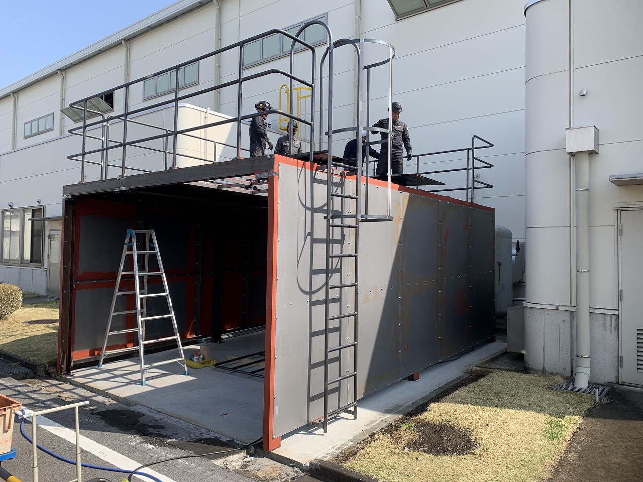 三方側面は鋼板パネルを取付、上部は滑り防止の為縞鋼板を取付ております。また、屋根部分には実際に人が昇降し作業する場合がありますので手摺を設け、前方にはシャッターを設置しております。最後に塗装仕上げにて完成となります。